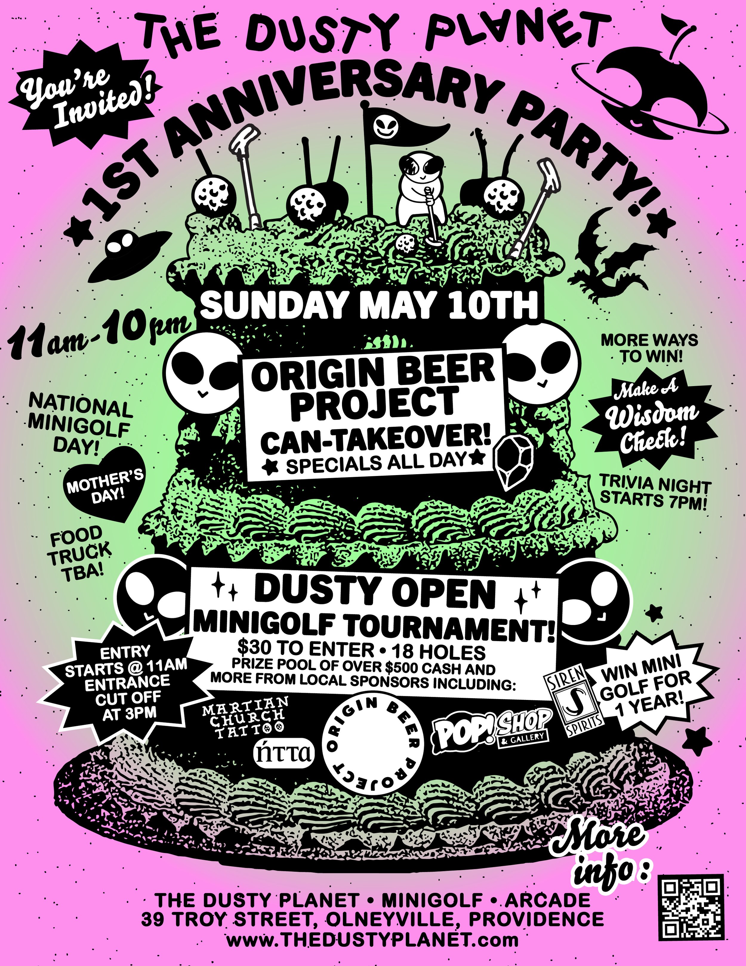 Starts 7PM in the arcade! Bring a team of 2+ and take on Evan the Castle Daddy’s ultimate Wisdom Check, featuring nerdy trivia, geeky quizzes, and Dusty Planet lore. Putt a hole-in-one for bonus points! Win big on this special anniversary edition.