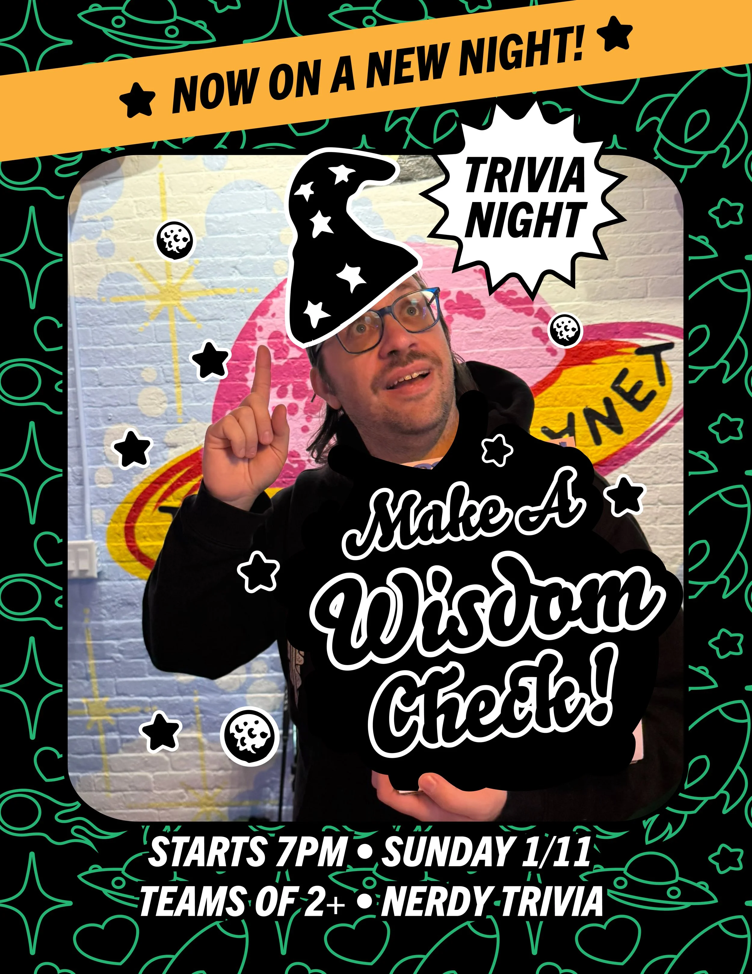 Back to All Events Wisdom Check Sunday, January 11, 2026 7:00 PM 9:00 PM The Dusty Planet 39 Troy Street Providence, RI, 02909 United States (map) Google Calendar ICS Join us Sunday 1/11 to Make A Wisdom Check! Nerdy Trivia at The Dusty Planet! Hosted by your game master Evan, teams of 2+ compete for prizes and to flex their geeky fandom. See you there quiz fans! Starts at 7PM